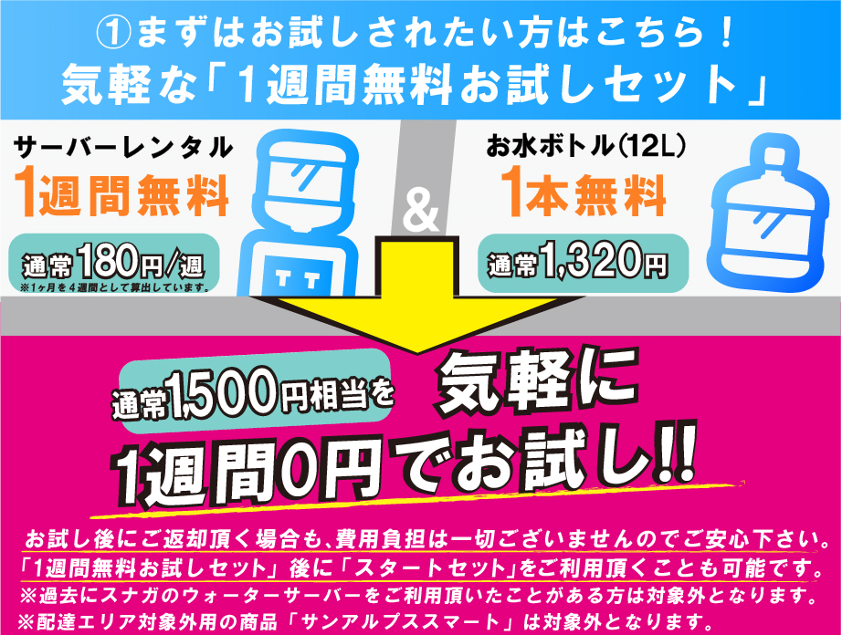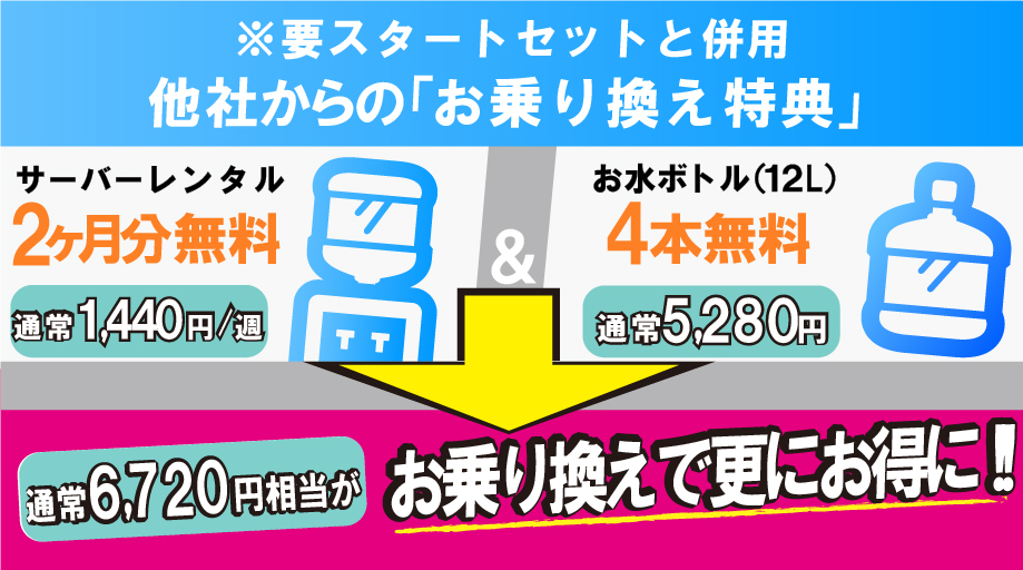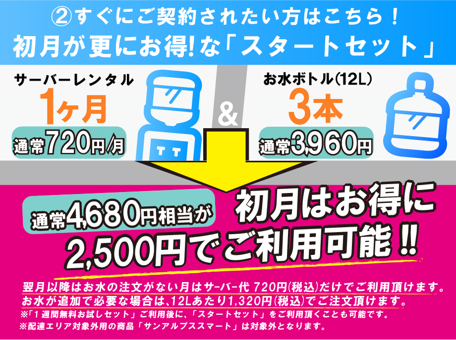 スタートセットお申込の方へ、サーバーレンタル期間を2ヵ月分無料&お水ボトル4本(計48L)を無料でプレゼント致します。
